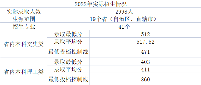 2022年,我校招生實際錄取2998人,生源范圍覆蓋19個?。ㄗ灾螀^、直轄市),招生專業共41個。其中:省內普通本科文史類錄取最低分512分、平均分517.52分,分別高出貴州省本科最低投檔控制線(471分)41分、46.52分;省內普通本科理工類錄取最低分403分、平均分411分,分別高出貴州省本科最低投檔控制線(360分)43分、51分。