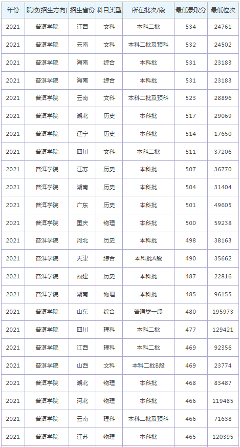 想要報考普洱學院的同學,都比較關注普洱學院今年的錄取分數線,那么,高考多少分可以上普洱學院呢?普洱學院歷年最低錄取分數線是多少?下面為大家整理了普洱學院錄取分數線,希望對大家有所幫助,僅供參考。![]() 2021普洱學院錄取分數線 ![]() ![]() 普洱學院是公辦還是民辦大學? 根據全國高等學校信息可知,普洱學院是公辦大學。通常來說,公辦大學學費便宜,民辦大學學費較貴。 ![]() 普洱學院簡介 普洱學院(Pu——er University)坐落在滇西南重鎮普洱,是云南省屬普通本科高等學校,由云南省人民政府舉辦,實行省市共管共建,以省為主的管理體制,是國家首批卓越農林人才教育培養計劃改革試點高校。 普洱學院的前身是思茅師范高等專科學校,于1977年開始籌建,1978年10月正式招生。1998年4月,云南省電大思茅分校成建制并入,同年9月,學校的管理體制調整為“省地共建共管,以省為主”。2012年3月29日經教育部同意在思茅師范高等專科學校的基礎上建立普洱學院。 通過對普洱學院錄取分數線的了解,大家大概知道了高考多少分可以上普洱學院,以上數據源于網絡,僅供參考,大家如果想要了解其他大學錄取分數線、大學簡介、大學排行榜、專業選擇等內容,請點擊訪問:大學欄目。 推薦閱讀: 新疆大學錄取分數線 西藏大學錄取分數線 喀什大學錄取分數線 石河子大學錄取分數線 蘭州大學錄取分數線 高考多少分可以上寧夏大學? 西北師范大學錄取分數線 |