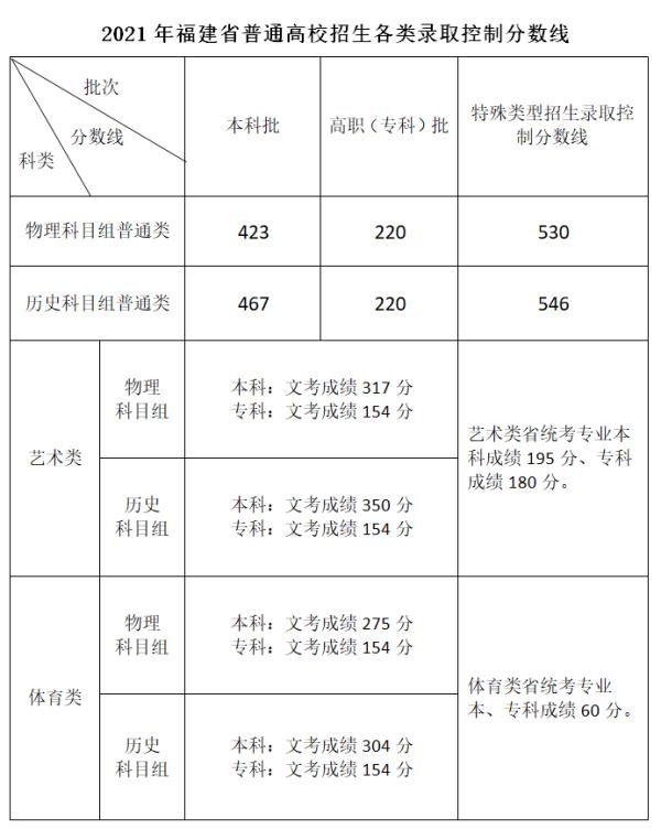 2021年福建高考錄取分數線一覽表