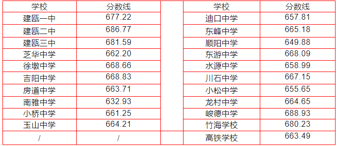 注:1、建甌一中定向生錄取最低控制分數線632.93. 2、未完成建甌一中定向招生計劃4人,按規定在14所農村中學進行補錄,其中吉陽中學補錄3人、東游中學補錄1人。 三、建甌一中中澳班錄取分數線:674.95 四、建甌二中統招錄取分數線:662.25 五、建甌二中定向招生各校錄取分數線