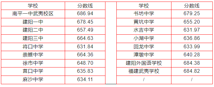 城區未完成的武夷山一中定向招生計劃,剩余的定向生指標面向城區調劑錄取分數線:670.40. 農村未完成的武夷山一中定向招生計劃,剩余的定向生指標面向農村調劑錄取分數線:619.70. 全市未完成的武夷山一中定向招生計劃,剩余的定向生指標面向全市調劑錄取分數線:662.53 三、武夷山二中統招錄取分數線:573.10 四、武夷山崇安外語高級中學統招錄取分數線:426.59 建甌市普通高中最低錄取控制分數線一、建甌一中統招錄取分數線:698.93 二、建甌一中定向招生各校錄取分數線