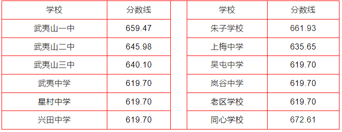 邵武一中未完成定向招生計劃,剩余指標按邵武市考生統一劃線:664.65 三、邵武四中統招錄取分數線:588.00 四、邵武七中統招錄取分數線:485.08 五、順昌金橋邵武招生錄取分數線:441. 64 武夷山市普通高中最低錄取控制分數線一、武夷山一中統招錄取分數線:689.70 二、武夷山一中定向招生各校錄取分數線